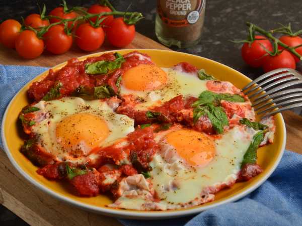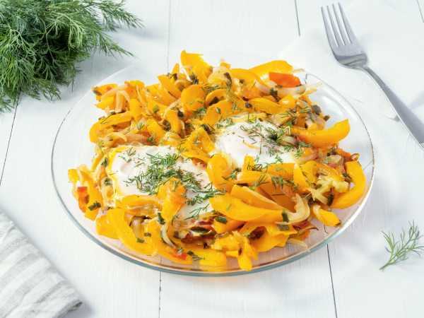 Важно, чтобы смесь на момент выключения огня оставалась влажной, слегка жидковатой. Иногда яйца даже не обжаривают с овощами, а добавив в сковороду, сразу выключают огонь. Так как соус горячий, то через пару минут под крышкой яйца в любом случае приготовятся на остаточном тепле чугунной сковороды.