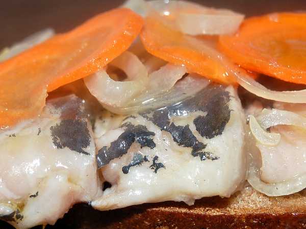 Кусочки филе селедки переносим на бумагу, убираем лишнее масло/влагу. Хлебные ломти (без корок) делим брусками, ориентируясь на размеры сельди, обугливаем на раскаленной сковороде без масла, с двух сторон.