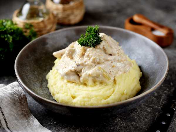 Добавить филе в сковороду, к поджаренным грибам, поджарить курицу пару минут и влить порцию сливок. Соль и перец добавлять по своему вкусу. Перемешать все и прикрыть сковороду крышкой. Томить подливу на небольшом огне примерно 12 минут. Спустя время снять пробу, довести вкус до желаемого и подавать сливочную подливу из курицы к столу.