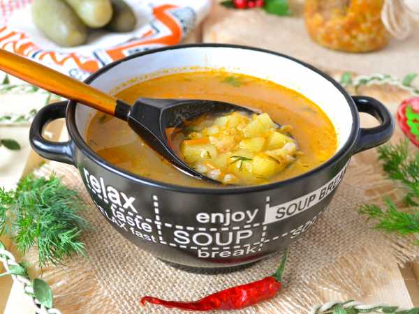 Следом отправляем в суп зажарку из соленых огурцов с томатом и толченым картофелем.
