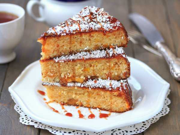 Готовность пирога можно проверять шпажкой. Еще ориентируйтесь на цвет верха - он покрывается румяной корочкой. Сиропом можно полить выпечку сразу.