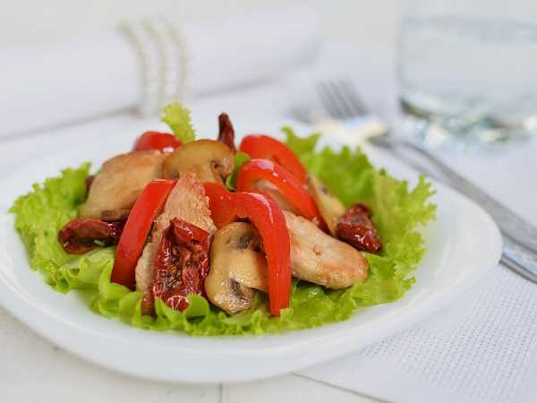 Красный лук вы можете заменить зеленым или маринованным репчатым - решайте сами. Заправку для салата добавочно создавать не нужно - в вяленых томатах присутствует ароматное растительное масло, которое и окутает все ингредиенты. Единственное, пробуйте их на соль, чтобы не пересолить блюдо.