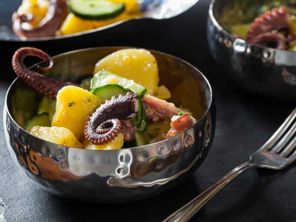 Отварную тушку кальмара полностью остудите, нарежьте крупными кольцами, добавьте их к основному составу.