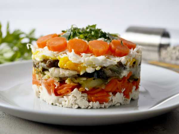 Оригинальный салат «Гнездо глухаря» с грибами готов и его можно подавать. Приятного аппетита!