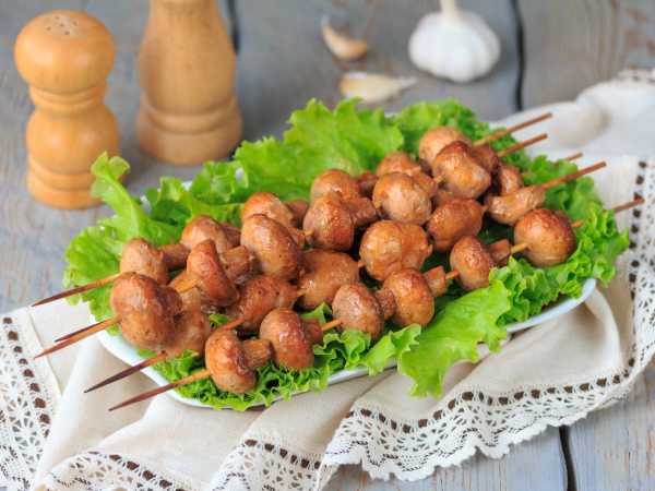 Готовность шампиньонов можно определить, слегка наклонив шампур или шпажку. Как только грибы начнут свободно скользить и скатываться по шампуру – готово, можно подавать блюдо к столу.