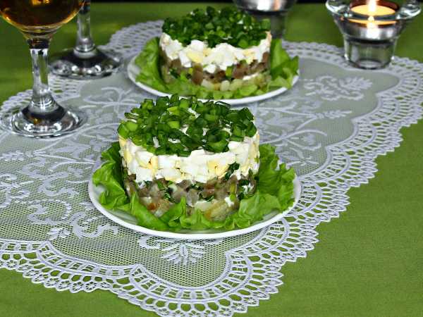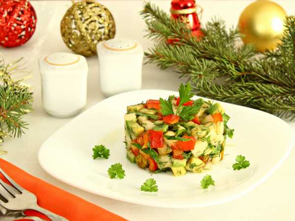 Подаем салат «Оливье» с яблоком и колбасой к столу.