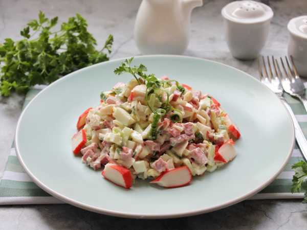 Салат «Валерия» с крабовыми палочками и корейской морковкой готов, приятного.