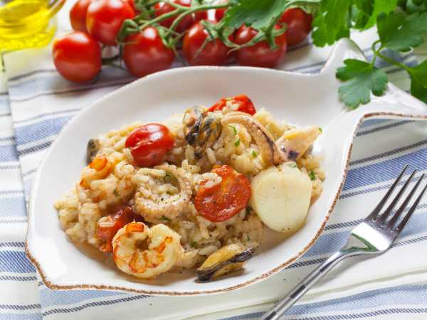 Выкладываем сухофрукты на сковороду, заливаем водой и всыпаем тщательно промытый рис. Солим блюдо и готовим до впитывания жидкости и мягкости риса.
