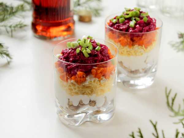 Аккуратно выложить сверху зёрна граната, немного утрамбовать салат, чтобы хорошо держались слои, и снять формочку.