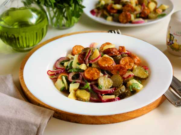 В первую очередь картофельный салат с солеными огурцами, кукурузой и орехами привлекает своим внешним видом: он яркий, пестрый и его сложно не заметить.