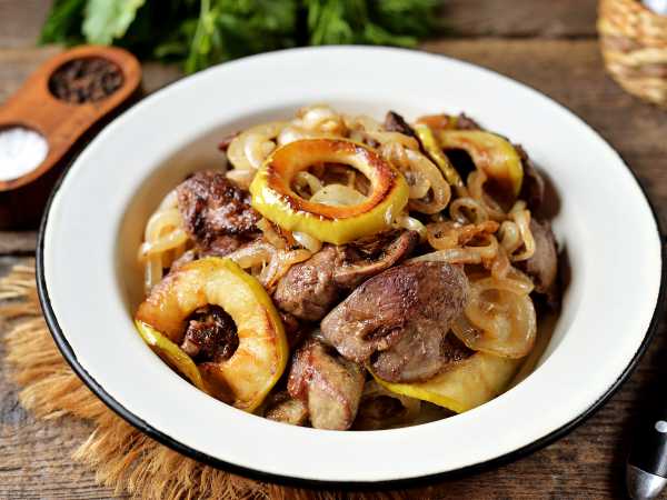 На яблоки выложите обжаренную печень в апельсиновом соусе.