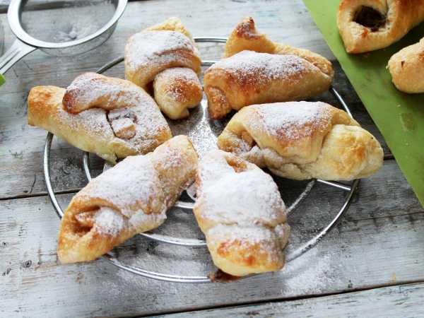 Рассыпчатые рогалики с корицей и сахаром готовы. Даем им остыть и посыпаем сахарной пудрой.