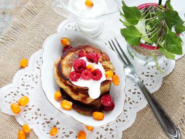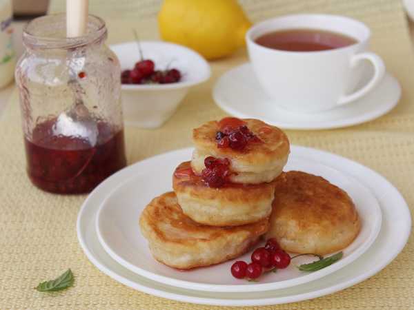 Оладьи на теплой ряженке готовы. Подайте их на стол в теплом виде совместно с жидким медом.
