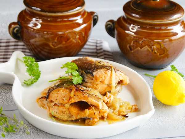 Рыбу выложите в глиняные горшки. Добавьте 50-70 мл воды.