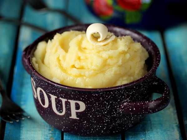 К этому времени картофель должен был свариться. Слейте воду, в которой варился картофель, в чашку. Сам картофель чуть поперчите, пробейте мялкой до однородного состояния. Подливая понемногу воду, регулируйте густоту пюре по своему желанию.