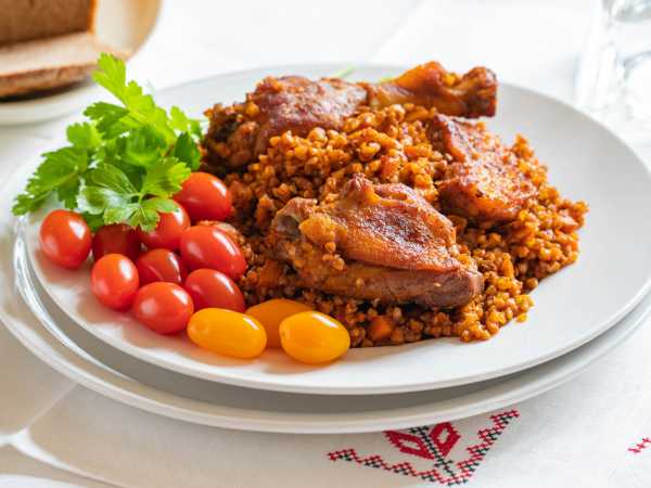 Готовим плов на среднем огне до впитывания жидкости и готовности крупы. Даём настояться блюду 15 минут под крышкой. После чего аккуратно перемешиваем содержимое сковороды, раскладываем по тарелкам и подаём к столу.