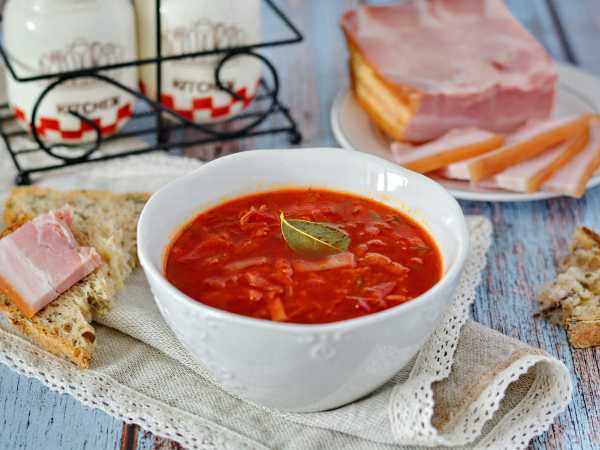 Даём борщу настояться и наполняем тарелки. Мы любим этот борщ есть со сметаной и подавать к нему зелёный лук и чёрный хлеб.