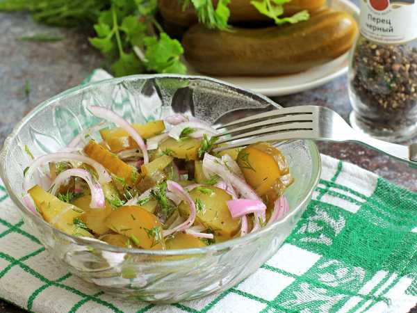 Посолите, добавьте измельченный укроп, перемешайте. Постный салат с фасолью и солеными огурцами готов к подаче!