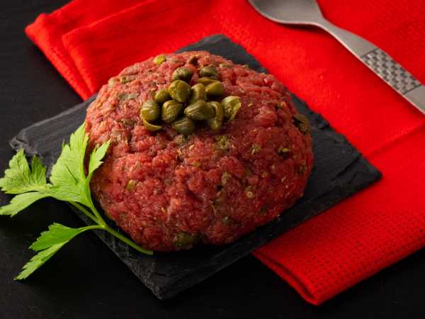 Один из самых простых способов сформировать порцию тартара аккуратным куполом - это выстлать куполообразную миску полиэтиленовой плёнкой, утрамбовать в неё тартар и перевернуть на тарелку.