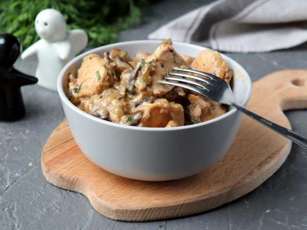 На конфорку поставьте отдельную сковороду, влейте масло, разогрейте до пика, внутрь закиньте курицу, жарьте на сильном огне до приобретения золотистого оттенка. К мясу закиньте шампиньоны, выпарьте весь грибной сок. Компоненты жарьте совместно 3 минуты.
