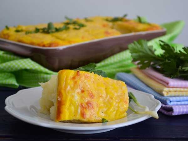 Завершает слой картошки. Готовим запеканку из картофельного пюре в мультиварке в режиме «Выпечка» 60 минут, после чего полностью остужаем в чаше, вынимаем на блюдо и подаем к столу.