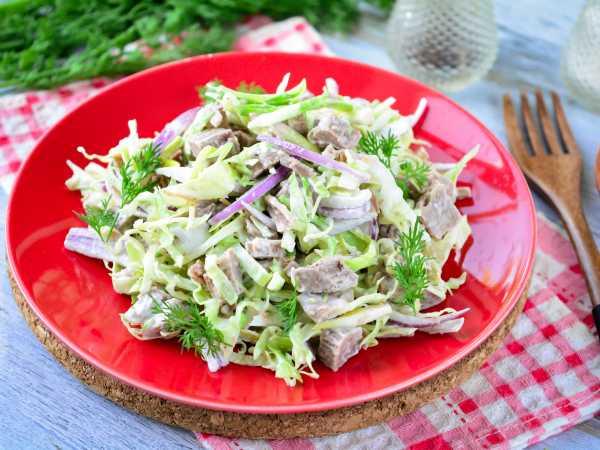Классический салат «Оливье» с говядиной готов, можно подавать на стол.