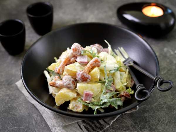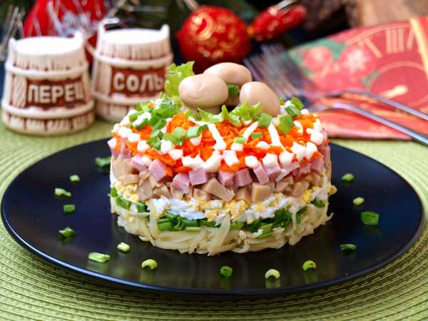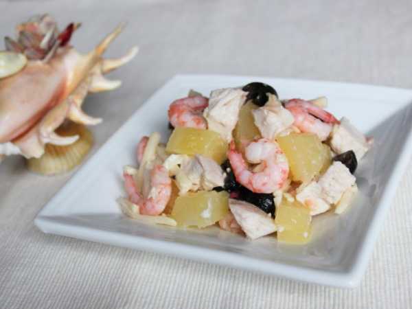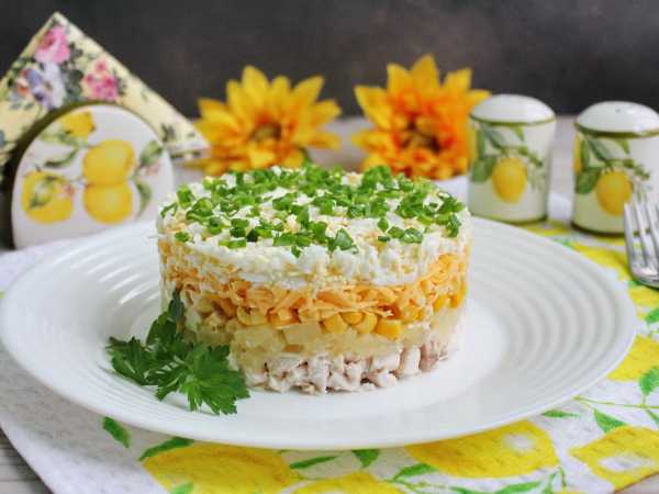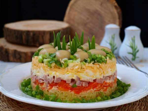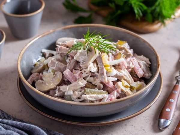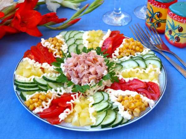 Салат «Фестиваль» с курицей, ветчиной, шампиньонами и ананасом готов! Сытный, веселый на вид, гармоничный на вкус, хотя в нём и много ингредиентов да ещё и майонез, он не ощущается тяжелым.