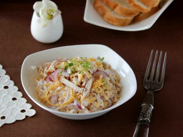 Куриное мясо тоже должно быть уже готовым:сваренное в кастрюльке в воде или на пару, либо запеченное. Куриное мясо нужно нарезать мелким кубиком.
