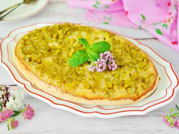 Ревень нарежьте на небольшие кусочки и выложите в тесто, перемешайте.