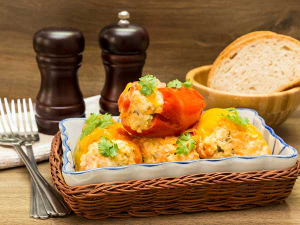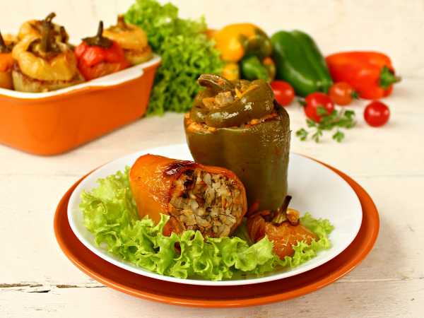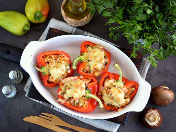 Среди множества рецептов фаршированного перца отмечу менее трудоемкий — без пассеровки овощей, отваривания риса и длительного тушения в соусе. Кроме того, если у вас, как и у меня, фарша оказалось мало, начинку можно увеличить за счет грибов и мякиша булки или другого хлеба.