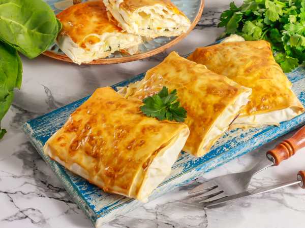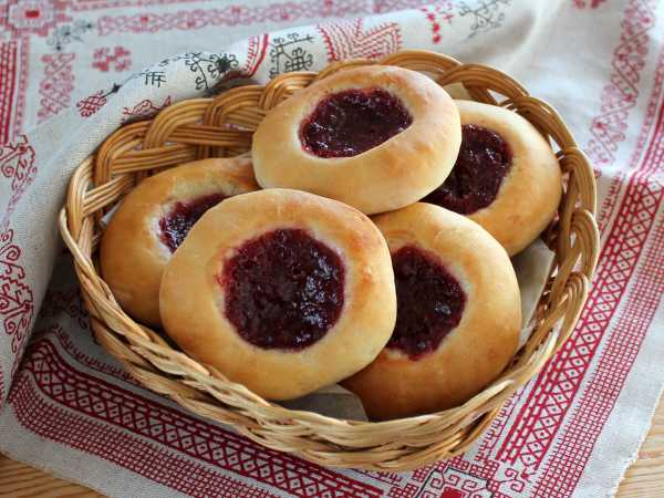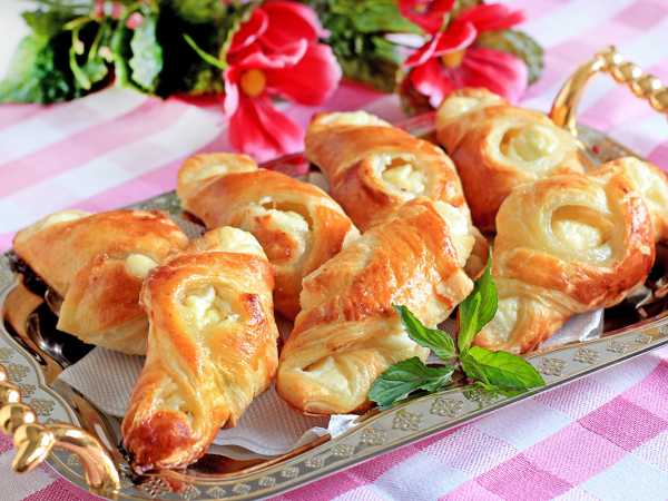 Тесто разморозьте и кружкой вырежьте круги диаметром 8 см. Выложите на противень, застеленный пергаментной бумагой. Наколите вилкой и выпекайте 20 минут при температуре 180 градусов. Слойки должны приобрести золотистый цвет.