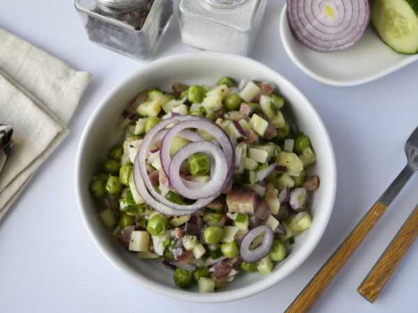 Приправляем салат большим количеством сметаны и ложечкой майонеза. Даём ему промариноваться не менее трёх часов, лучше 4. После этого можно оценить, сколько вам нужно соли дополнительно (и нужно ли, потому что солёность сельди бывает разная).