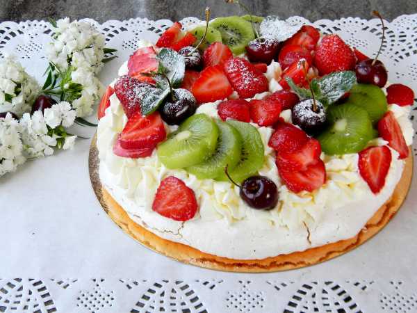 Соберите торт. Коржи смажьте кремом, а сверху выложите малину, количество которой регулируйте по своим предпочтениям. Торт не нуждается в пропитке, коржи просто воздушные и малина еще даст сок.