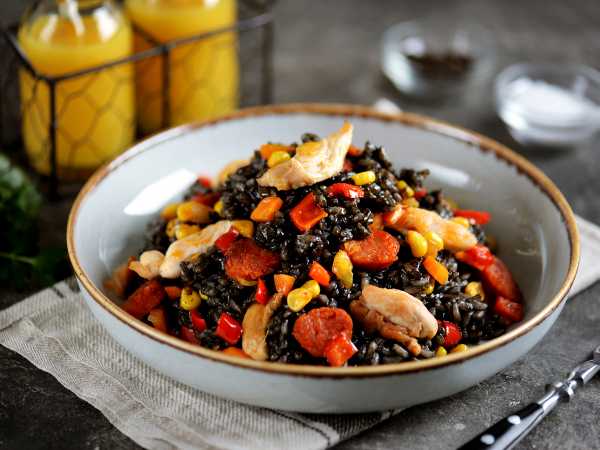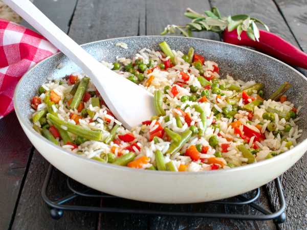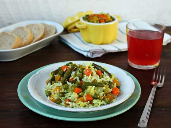 Овощная паэлья подойдет для постной или вегетарианской диеты, овощная составляющая может меняться от случая к случаю. К примеру, можно использовать лук, перец, помидоры, стручковую фасоль, кабачки, горошек и кукурузу, а также грибы. Так как паэлья - это настоящий испанский плов, рис нужно брать среднезерный или длиннозерный, но никак не круглый. Также в состав паэльи обязательно должен входить шафран.