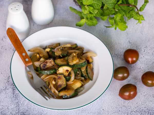 На сковороде разогрейте пару ложек масла для жарки. Для большего аромата я часто обжариваю в течение минуты зубчик чеснока, нарезанный пластинками. Затем его убираю и приступаю к обжариванию овощей.