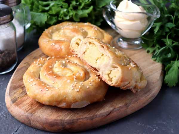Переложите заготовки на выстеленный пекарской бумагой противень, смажьте взбитым яйцом. Отправьте сосиски в тесте с картошкой в духовку, предварительно разогретую до 180 градусов, на 20 минут.