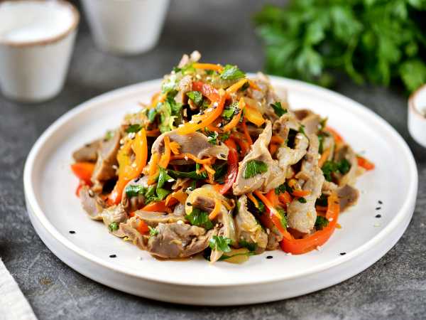 Шампиньоны обжариваем в масле, после добавляем к ним отварные желудки. Основные ингредиенты дополняем овощами. Главное правило приготовления — не жарить овощи долго, иначе это получится рагу, а не теплый салат. Овощи должны лишь слегка напитаться маслом и стать теплыми, при этом оставаться плотными и хрустящими.