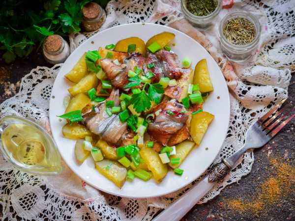 Чистим картошку и режем её не слишком тонкими пластинками - так, средним калибром. Заливаем горячим бульоном и маринуем где-то 2-3 часа, пока бульон полностью не впитается в картошку.