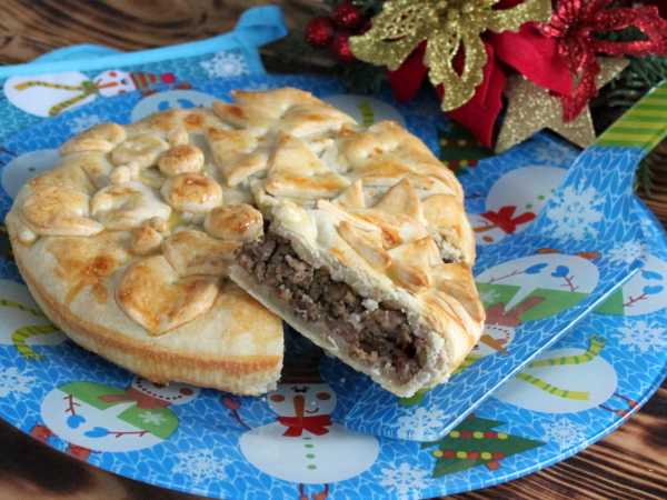 Этот пирог напоминает кавказские пироги, но я не берусь утверждать чей это рецепт. В формовке пирога есть сходство с хычинами, но их раскатывают очень тонко и тесто готовят на дрожжах. Этот пирог не сложен в исполнении и получается очень вкусным. Мясо для него лучше всего брать пожирнее, а для сочности добавлять в фарш молоко или сливки, поверьте - совсем другой вкус.