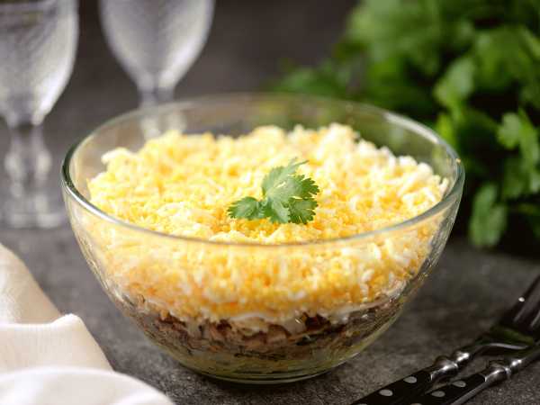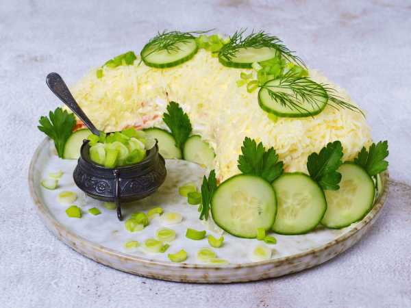 Смажьте майонезом и посыпьте натертым на мелкой терке яичным желтком.