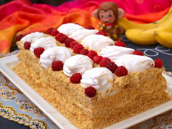 Собранный торт обернем пищевой пленкой и уберем на ночь в холодильник.