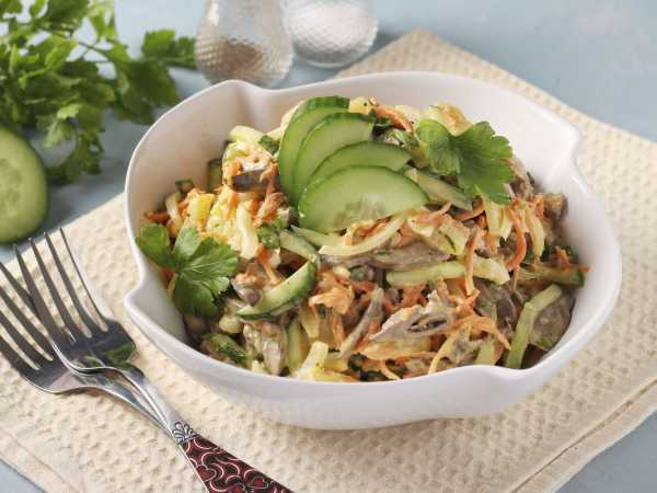 Салат с куриными сердечками и солеными огурцами отлично подойдет для ужина, в смысле, им вполне можно заменить ужин. Он сытный, вкусный.