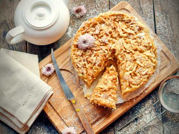 Поставьте пирог в разогретую до 180 градусов духовку примерно на 50-60 минут. Спустя указанное время насыпной пирог «Три стакана» с яблоками будет готов. Оставьте его в духовке до полного остывания, так пирог легче будет нарезать на кусочки.