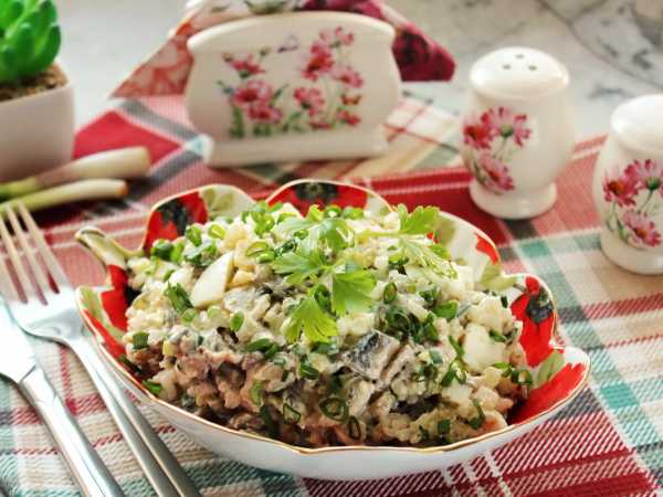 К столу салат с рисом и грибами подайте сразу же после его создания.
