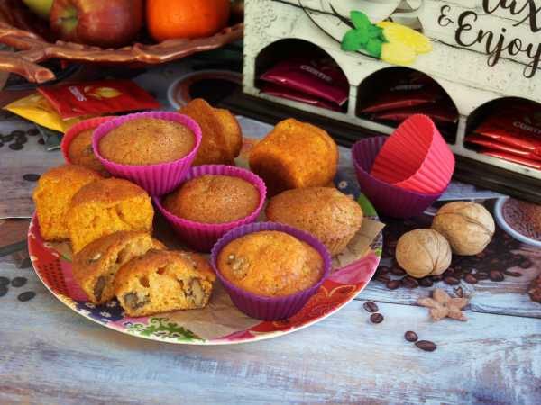 Заполнить тестом формочки для кексов на 2/3 и выпекать в разогретой до 180 градусов духовке 20 минут, до сухой шпажки.