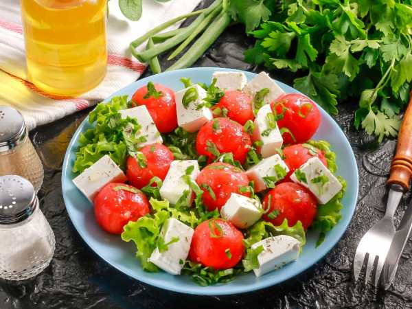 Нарезать небольшими кубиками сыр фета.