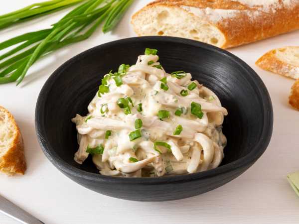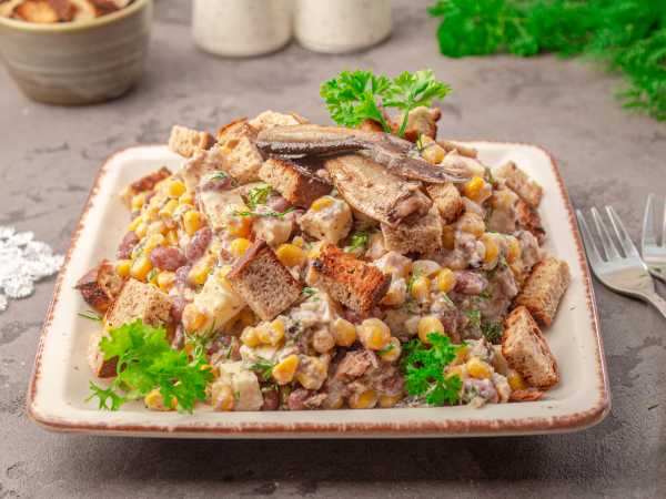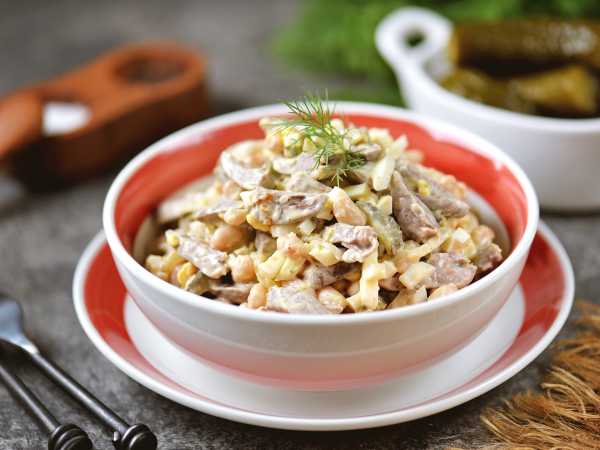 Продукты для приготовления салата с жареными грибами, фасолью и соевым соусом подготовьте по списку ингредиентов.