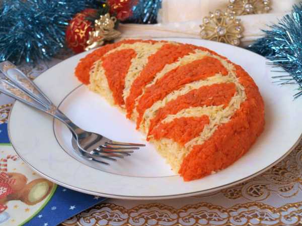 Из указанного количества ингредиентов у меня получилось два салата, выложенных в кольца небольшого размера. Чтобы ориентироваться — один салат рассчитан на 2 порции.