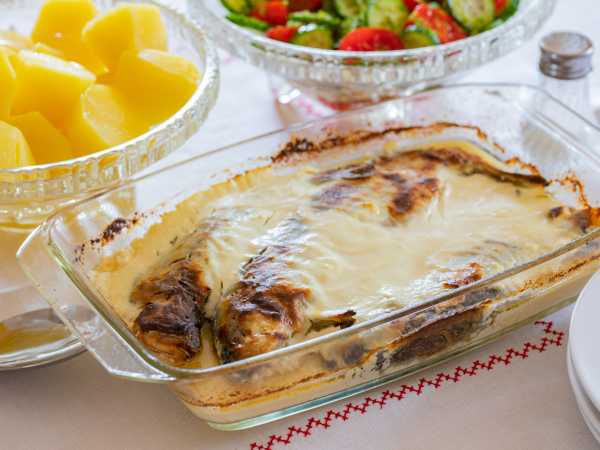 Если запекаете в духовке, то накройте форму фольгой, время запекания будет минут 35 при 200 градусах.
