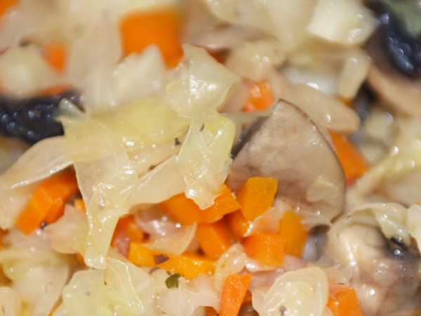 Тушеная красная капуста с куриными сердечками и грибами готова.